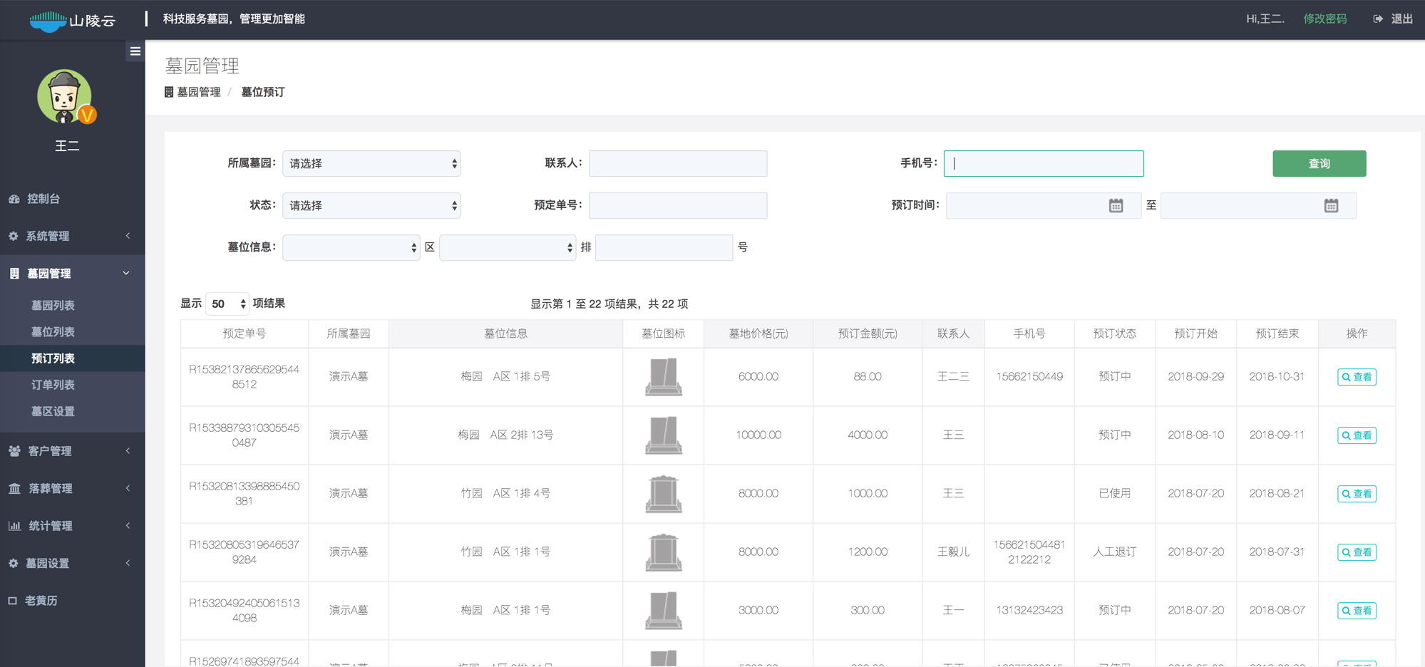 山陵云业务管理系统按照陵园的业务系统进行设计,组建陵园的企业生产管理系统;整个单位的业务流程,全部借助计算机来进行管理,结合先进的管理思想,借助现代计算机技术和方法,提升业务信息纵向横向传输效率和质量,实现墓地销售、结算管理(收费、退费)、工程管理、安葬管理、售后服务、迁葬管理、墓地管理期限到期提醒、便民查询等进行全方位业务管理,具有各种统计、分析、查询、打印数据和报表的管理功能。